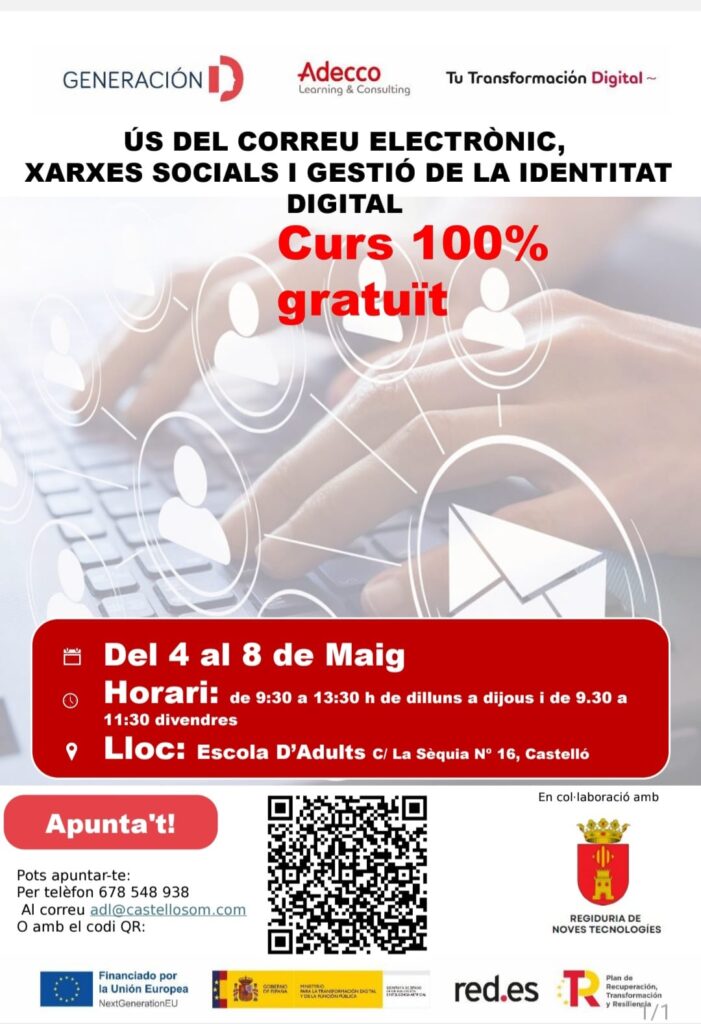 El curs, titulat “Ús del correu electrònic, xarxes socials i gestió de la identitat digital”, es desenvoluparà del 4 al 8 de maig a l’Escola d’Adults, situada al carrer La Sèquia número 16. Les sessions tindran lloc de dilluns a dijous de 9:30 a 13:30 hores, mentre que divendres l’horari serà de 9:30 a 11:30 hores.