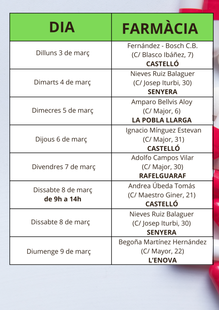 DestacatsNoticies Farmàcies de guàrdia de la setmana del 3 al 9 de març marzo 4, 2025 Compartir 0 minuts de lectura El Miragall marzo 4, 2025 marzo 4, 2025 Compartir aquest article Facebook Twitter Email Copy Link Imprimir Segueix-nosTroba'ns en les xarxes socials 1.2k Like 525 Follow 1.4k Follow Noticies Populars Continua la campanya de fumigació contra el mosquit tigre als rius junio 14, 2022 El cementeri de Castelló sofreix diversos robatoris en els últims mesos febrero 3, 2021 Recull de fotografies antigues i documentació de la Fira de Santa Llúcia diciembre 1, 2021 Emocions i tradició en el concert del Cor Mixt de Jubilats octubre 19, 2018
