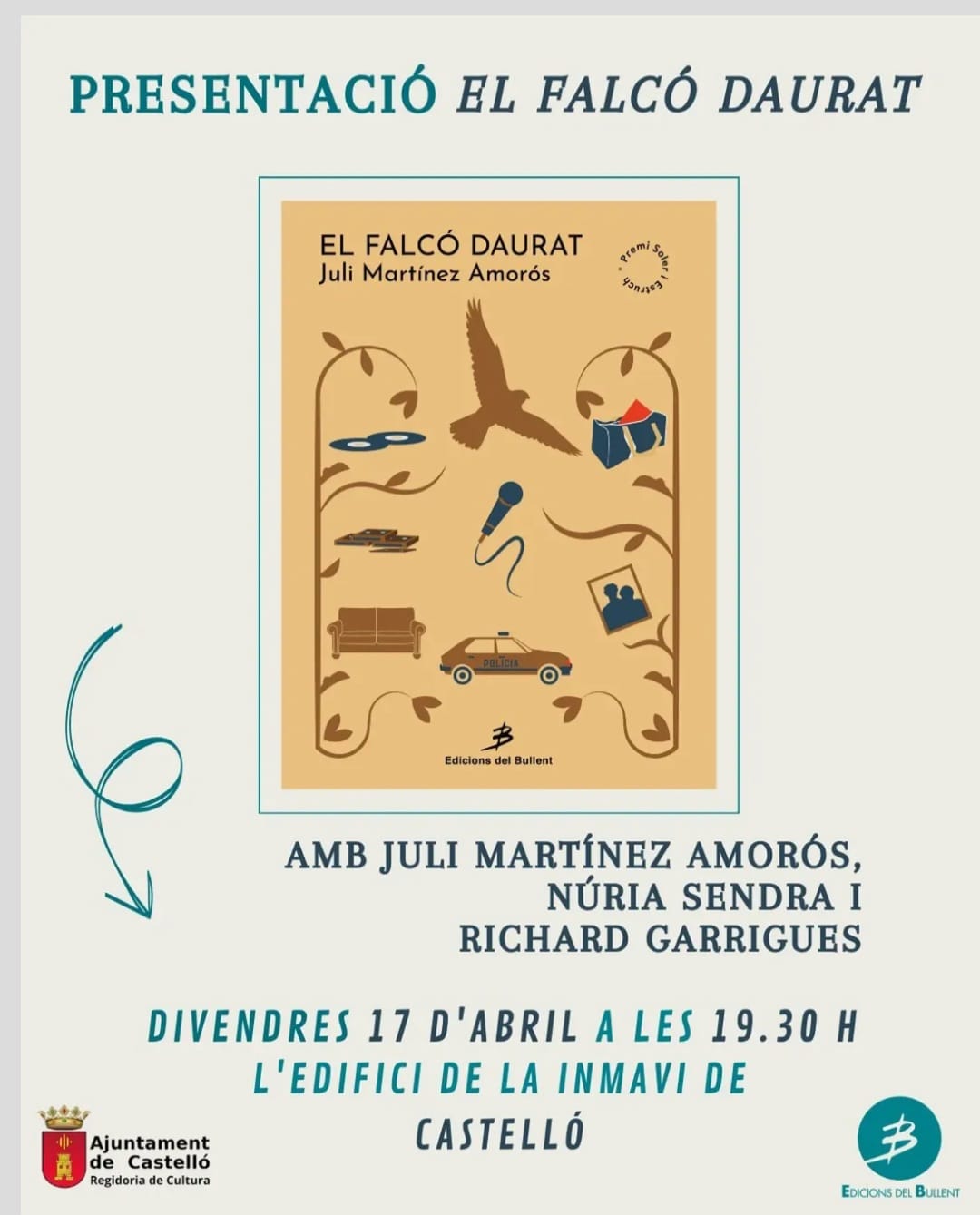El pròxim divendres 17 d’abril a les 19:30 hores a l’edifici de la INMAVI tindrà lloc la presentació de la novel·la «El falcó daurat» de Juli Martínez Amorós, guanyador del Premi Soler i Estruch 2025.
