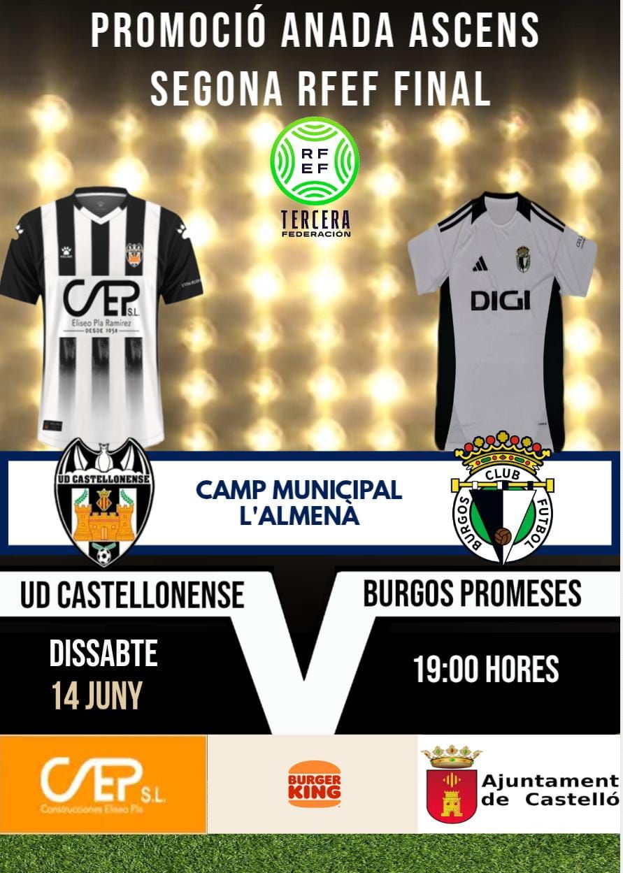 Demà dissabte 14 de juny a les 19:00 hores al camp de l’Almenà tindrà lloc el partit d’anada de la final de promoció a Segona Federació, on l’UD Castellonense s’enfrontarà al Burgos Promeses en un partit que sens dubte estarà molt disputat.